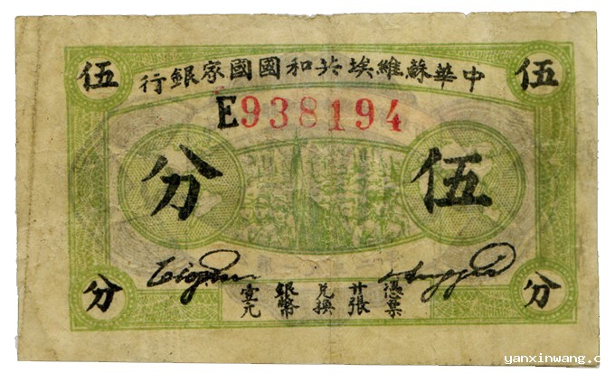 正面:绿色,上端为行名及票号;中部为红军图案;下端为两个外文签名及“凭票廿张兑换银币壹圆”字样;四角为面额“伍”、“分”字样。背面:蓝紫色,中部团状图案内印有行名、党徽、面额“0.05”及印制时间“公历一九三二年”。