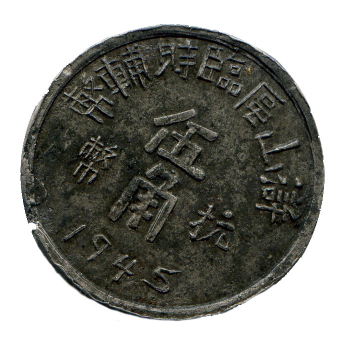 浙东根据地货币,锡铅质,重10.7克,直径32mm。正面为“浒山区临时辅币”、“抗币”、“伍角”及铸造时间“1945”。背面无图案。